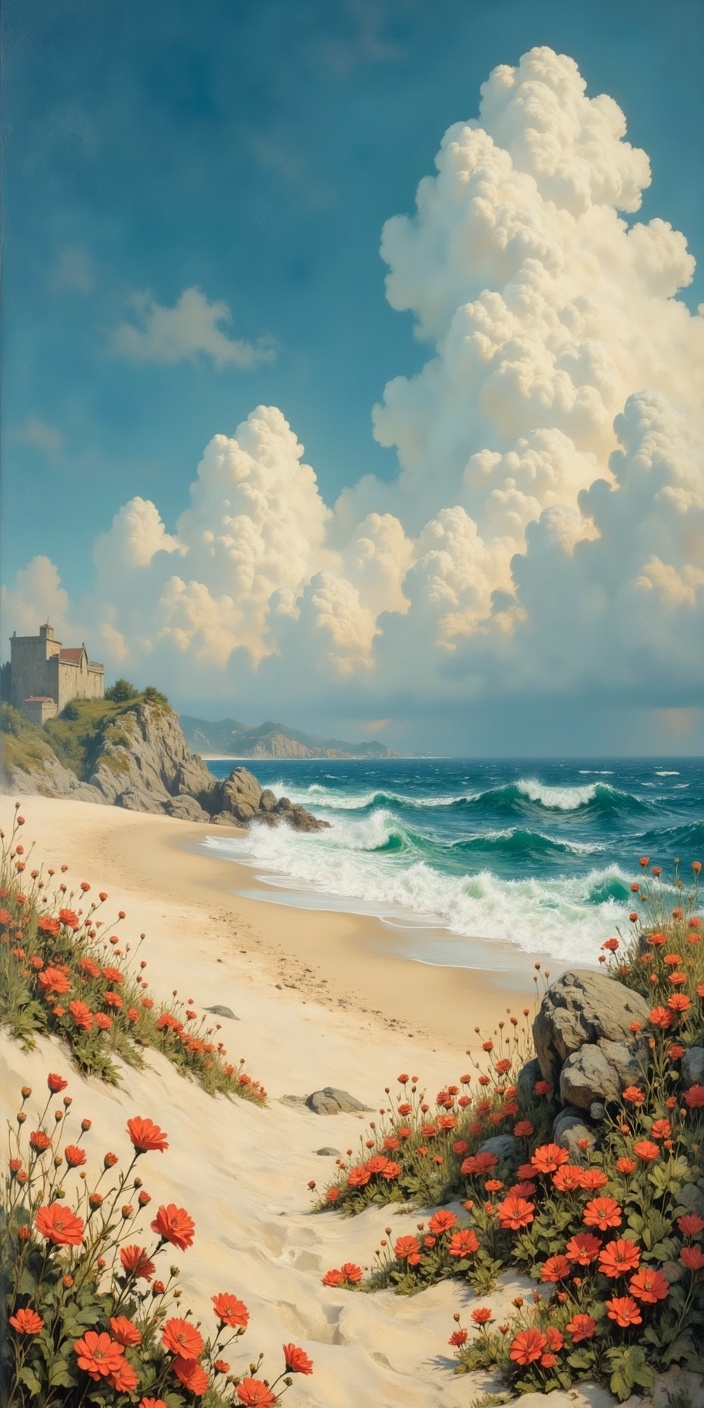 Waves crash on the sandy beach, surrounded by vibrant flowers and under a sky filled with fluffy clouds and striking sea views.
