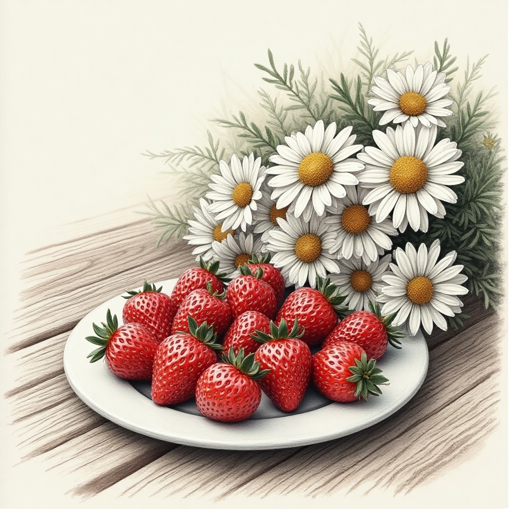 Strawberries are arranged on a white plate beside fresh daisies on a wooden table, creating a charming, rustic display.