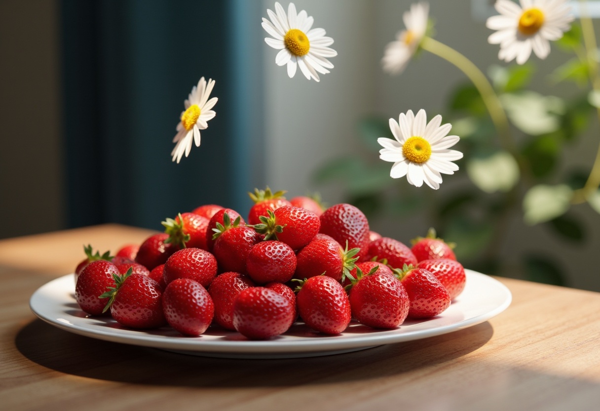 Ripe strawberries are arranged on a white plate while daisies float softly above, creating a vibrant and refreshing atmosphere indoors.