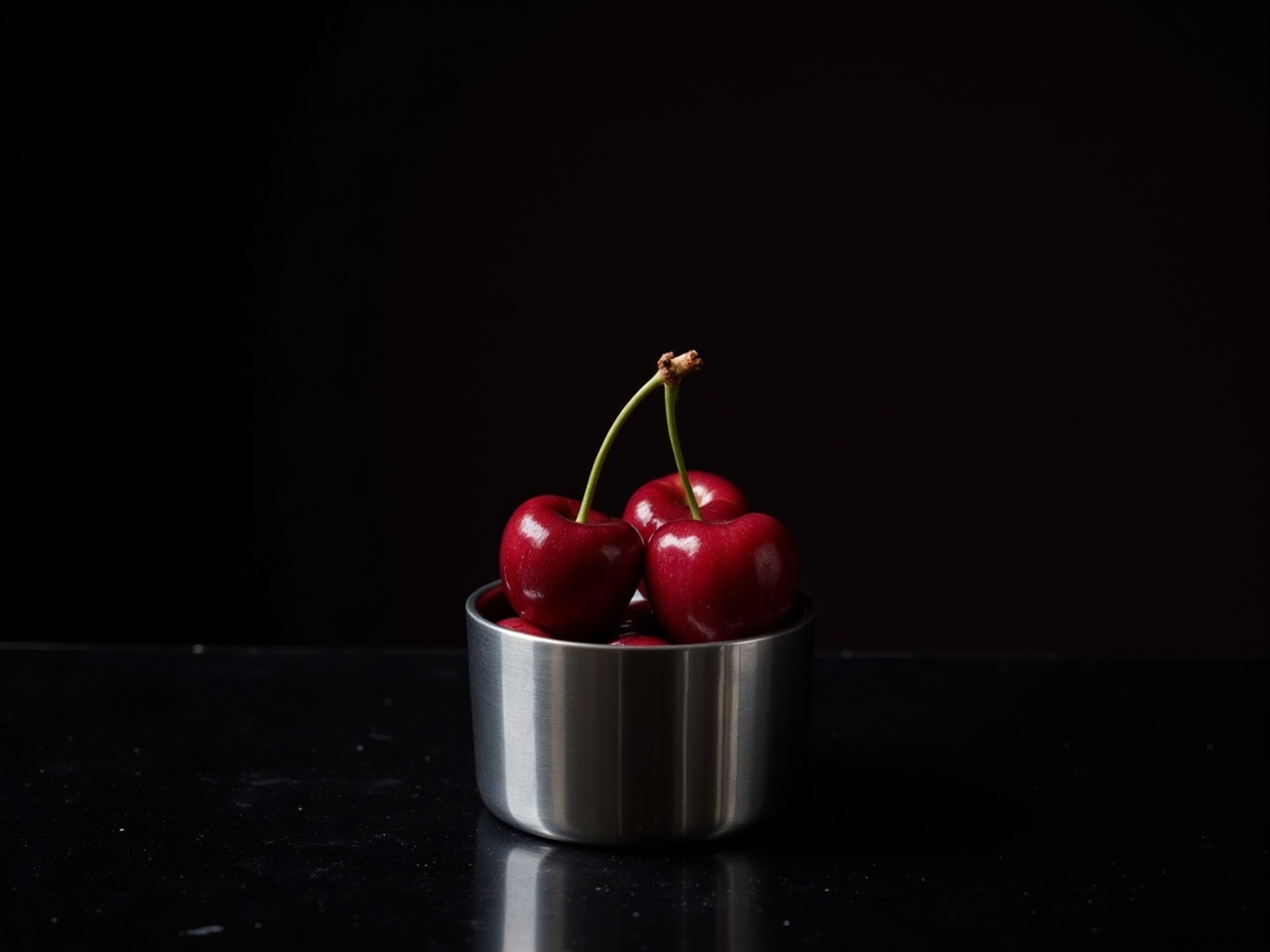 arrangement, cherries, culinary art, dark background, delicious, dessert, fresh fruit, glossy texture, gourmet, healthy snacks, kitchen, natural, nature, nutrition, organic, ripe, seasonal, silver bowl, simplicity, still life