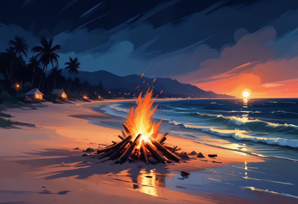 A warm bonfire lights up the beach as the sun sets over waves, creating a serene atmosphere with palm trees in the background.