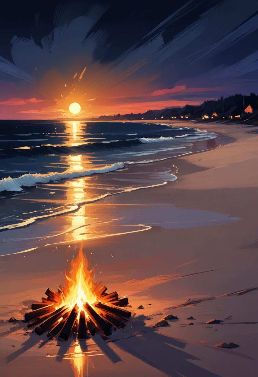 A tranquil beach scene features a bright sunset reflecting on water, with a warm campfire set on the sand. Friends gathered nearby enjoy relaxation.