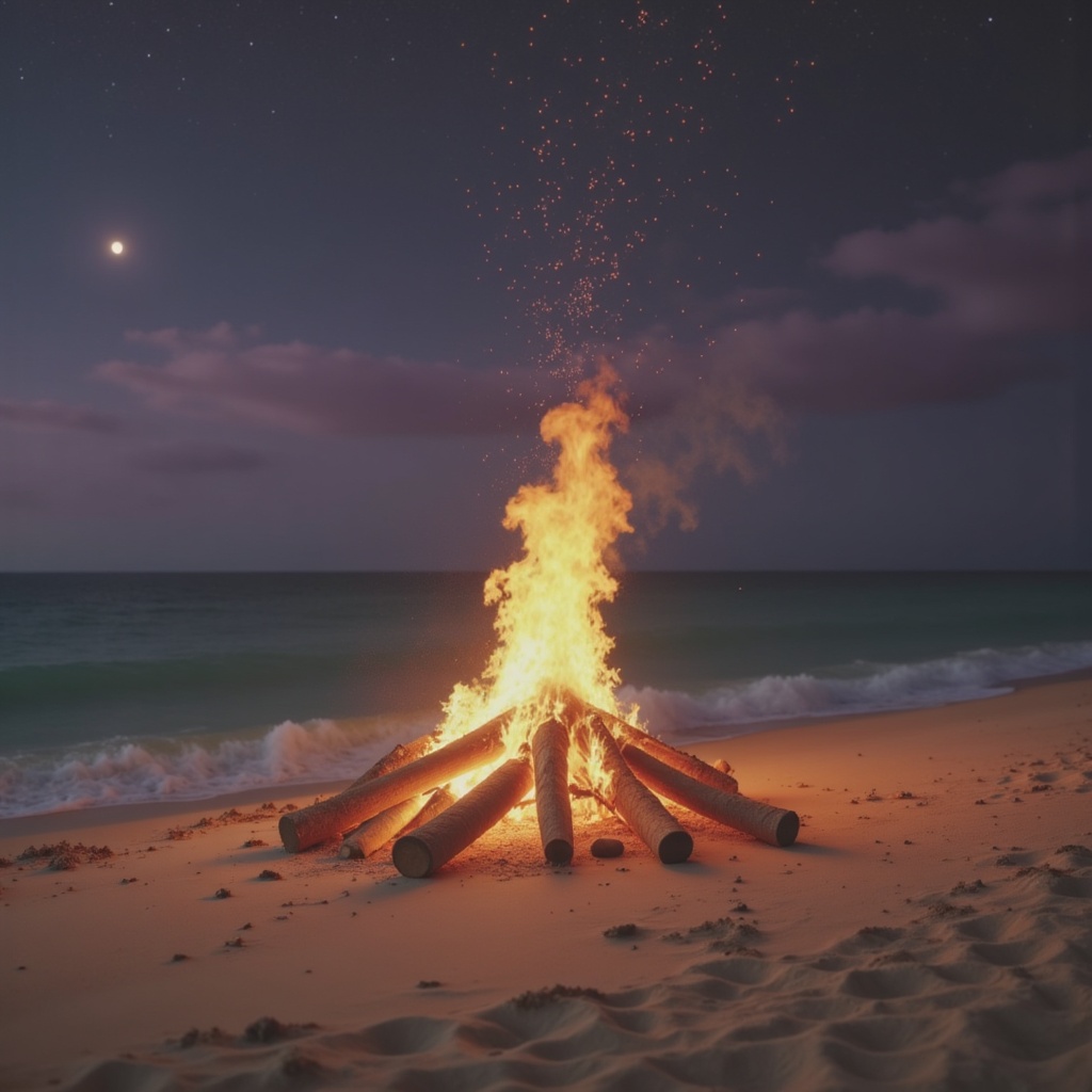 Bright flames dance around logs near the shoreline, illuminated by moonlight and surrounded by gentle ocean waves at night.