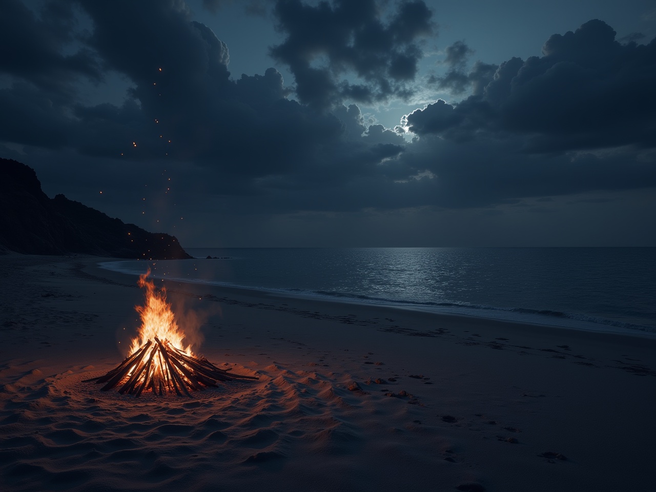 A bright campfire illuminates a serene beach during the night, with dark clouds hovering above and gentle waves lapping the shore.