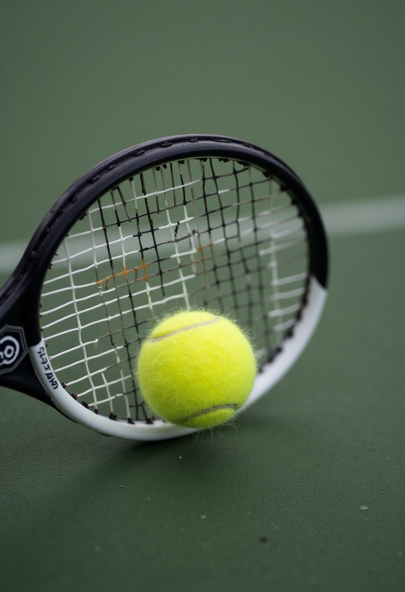 A bright yellow tennis ball sits on the strings of a black tennis racket on a green court, capturing the moment of play during a match.