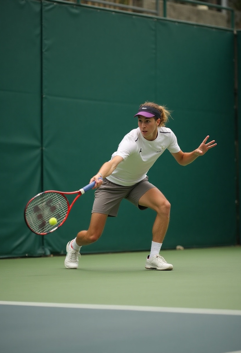 A young tennis player trains indoors, focusing intently as they prepare to hit the ball. The atmosphere reflects serious dedication.