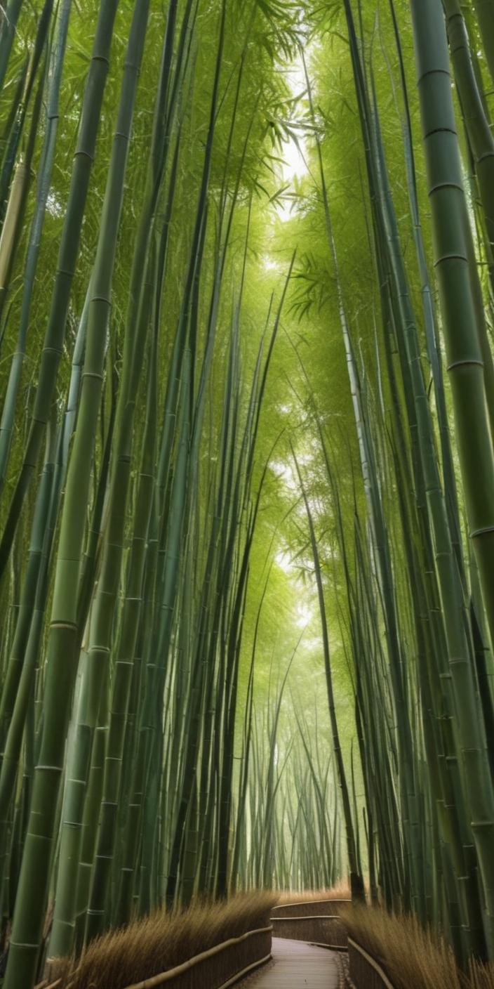 A tranquil pathway winds through a lush bamboo forest, with towering green stalks reaching towards a misty sky above.