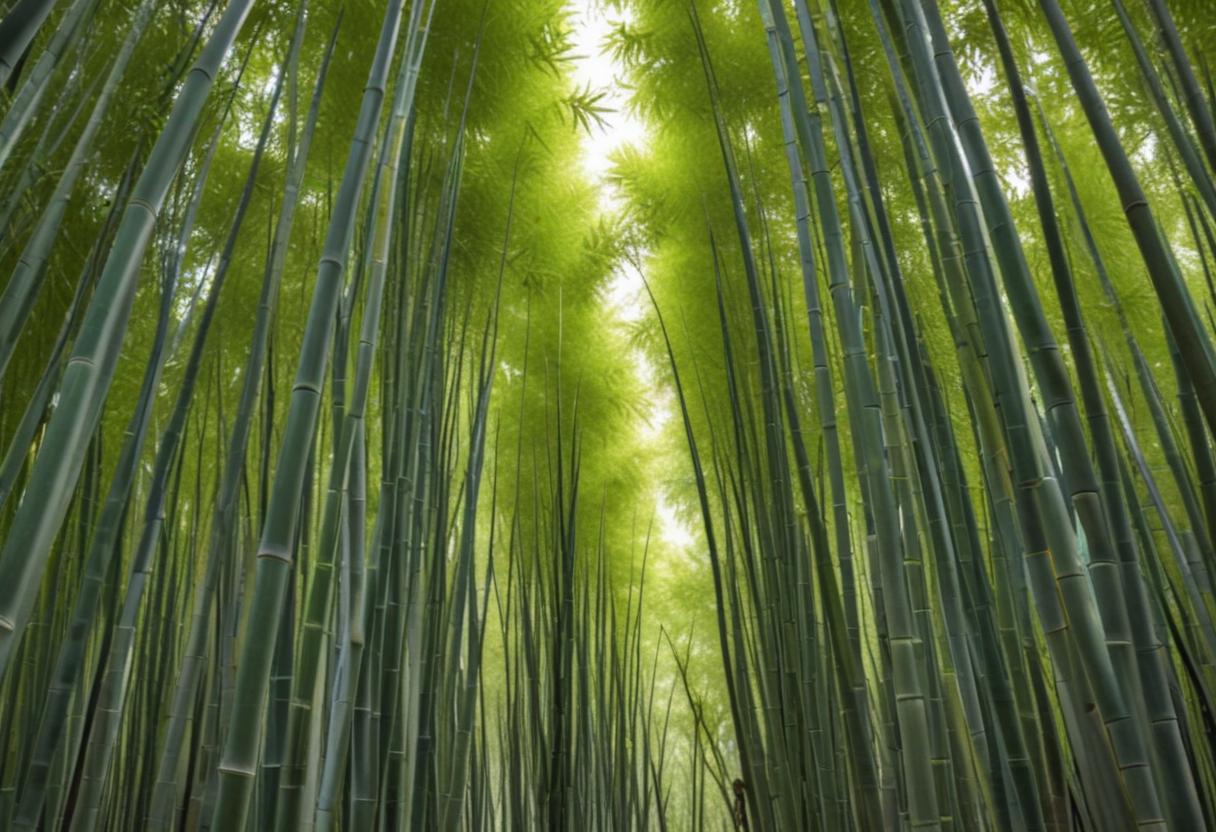 Tall bamboo stalks create a peaceful atmosphere in a lush green forest, inviting visitors to connect with nature under soft light.