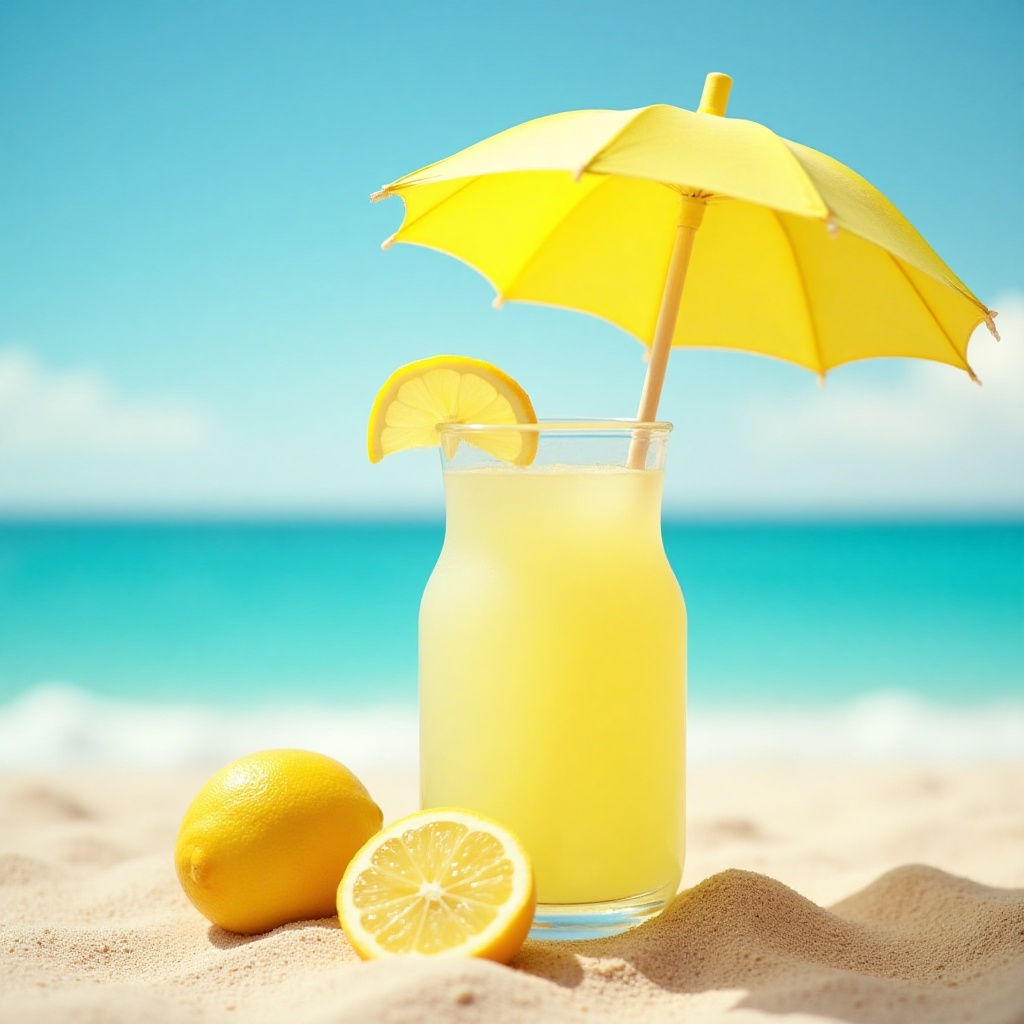 A clear glass of lemonade with a yellow umbrella sits on soft sand, accompanied by fresh lemons, against a tranquil blue ocean backdrop.
