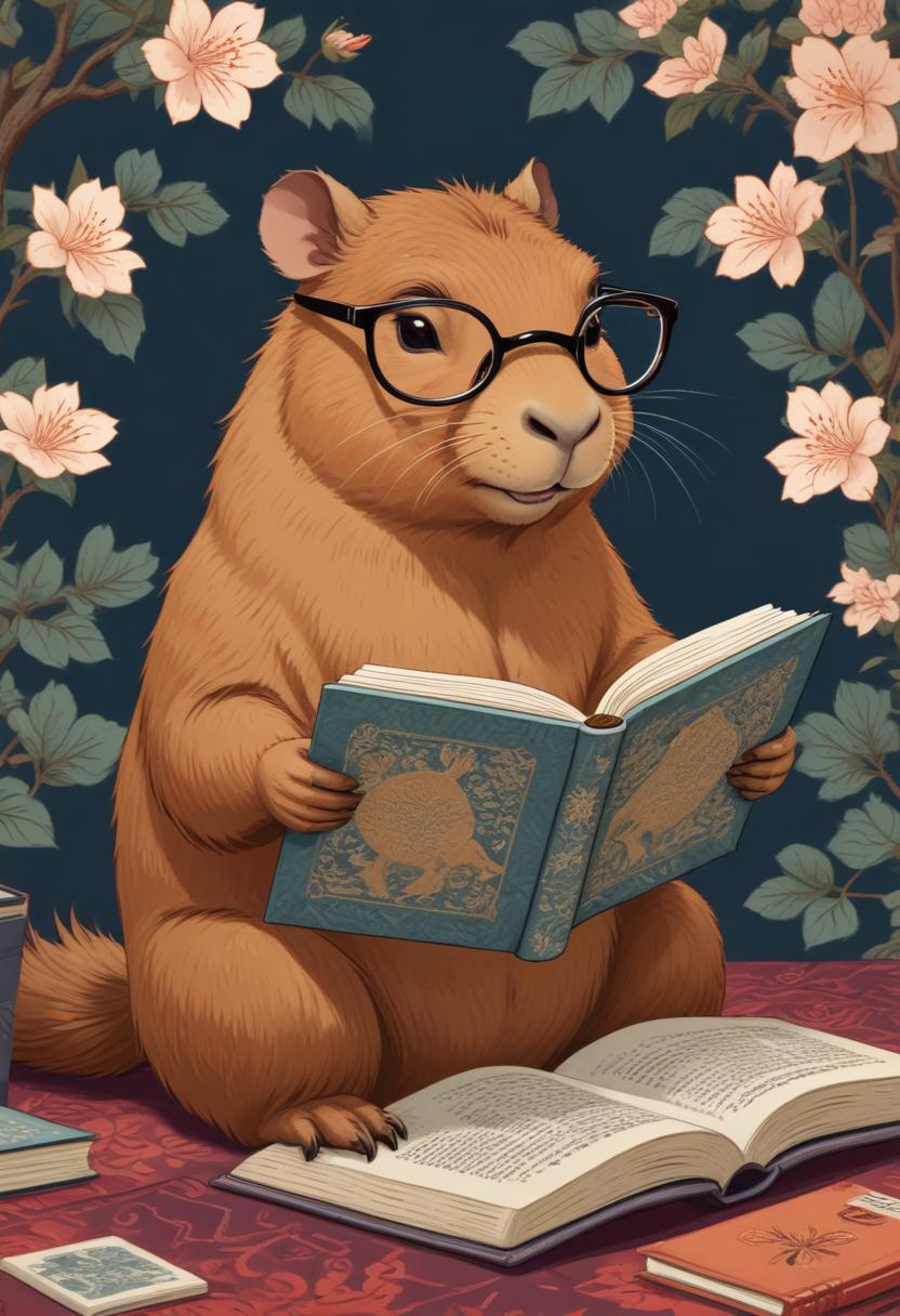 A furry squirrel wears glasses and sits surrounded by books, engaging deeply in reading amidst floral decorations, creating a warm atmosphere.