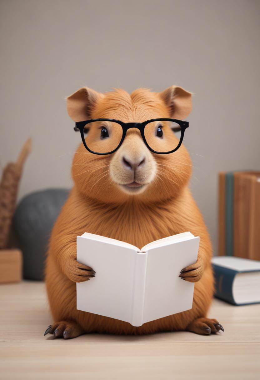 A guinea pig with glasses holds an open book, displaying a curious expression. The setting includes cozy decor elements.