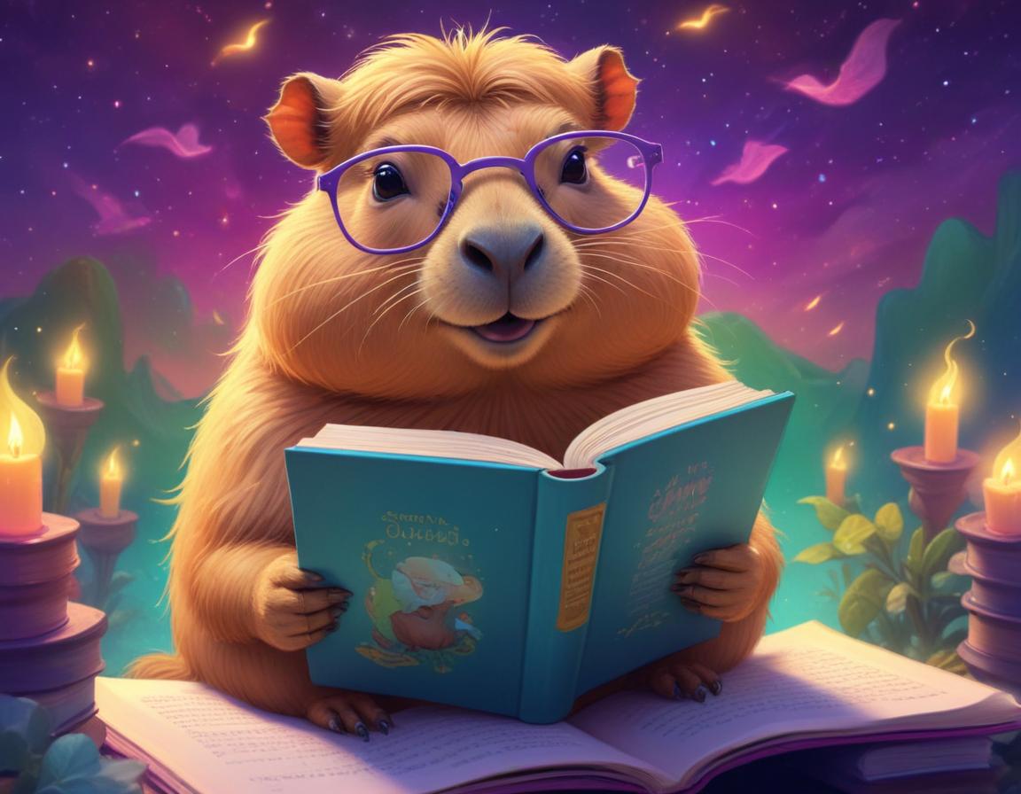 A cute rodent wearing glasses enjoys a storybook by candlelight, surrounded by glowing candles and a magical atmosphere.