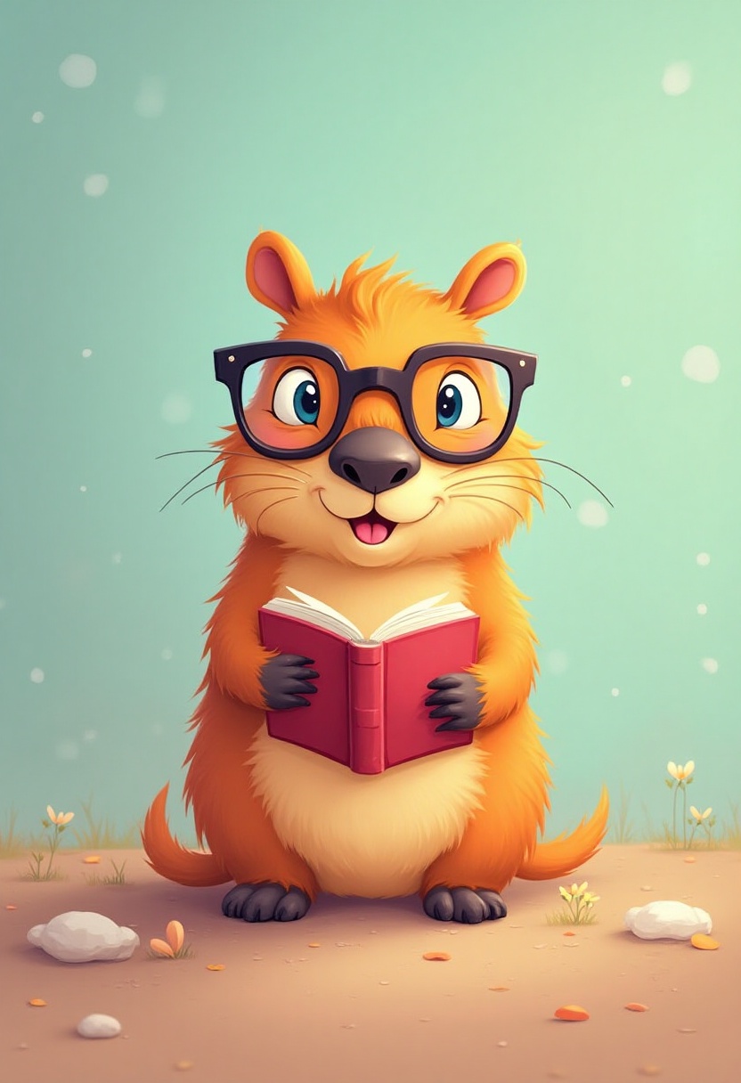 A cheerful furry creature with glasses happily reads a book while standing on a grassy area sprinkled with flowers and pebbles.