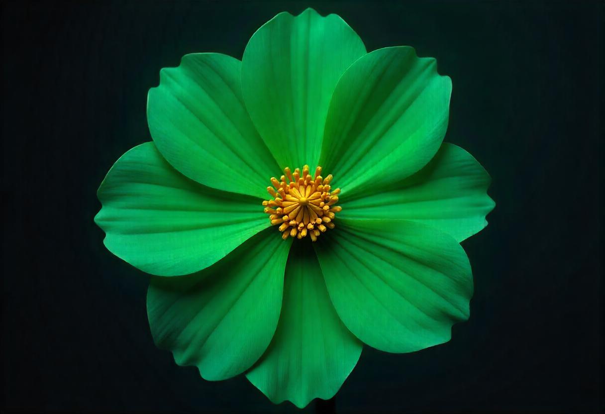 A striking green flower showcases its vibrant petals and yellow center, creating a captivating visual against a dark backdrop.