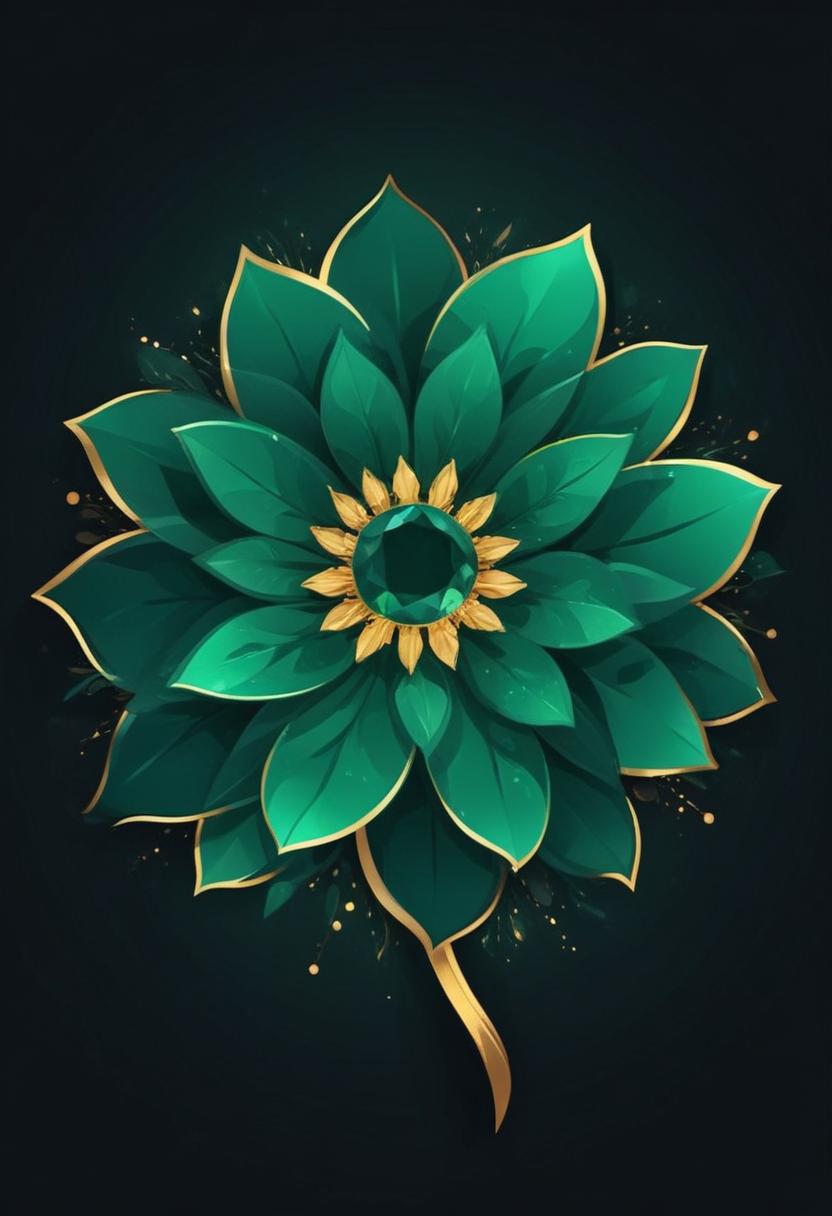 botanical art, creative design, dark background, decorative art, detail-oriented, floral illustration, flower design, gem, golden accents, graphic art, green color, illustration, intricate patterns, jewel tones, leaf patterns, modern art, nature theme, symmetrical design, vector graphic, visual art