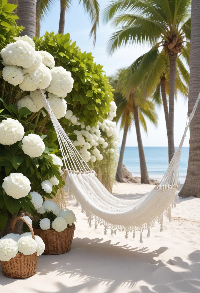 A serene hammock is gently swaying between palm trees, surrounded by blooming white flowers near a tranquil beach.