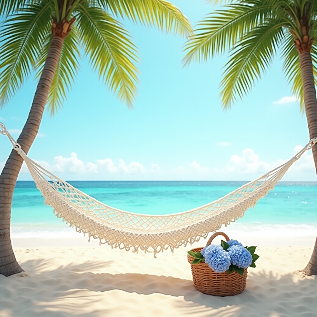 Relaxation is found in a hammock tied between palm trees, with a basket of flowers nearby on a warm, sunny beach.