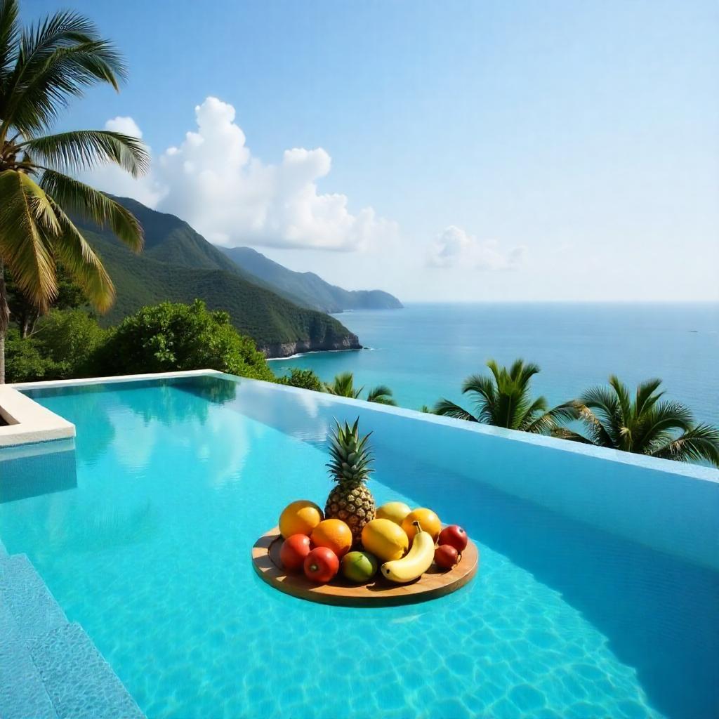 Scenic fruit display by a luxury pool overlooking ocean