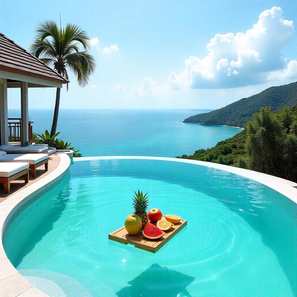 Bright tropical infinity pool overlooks the ocean, featuring a colorful fruit display on a wooden tray floating in the water.