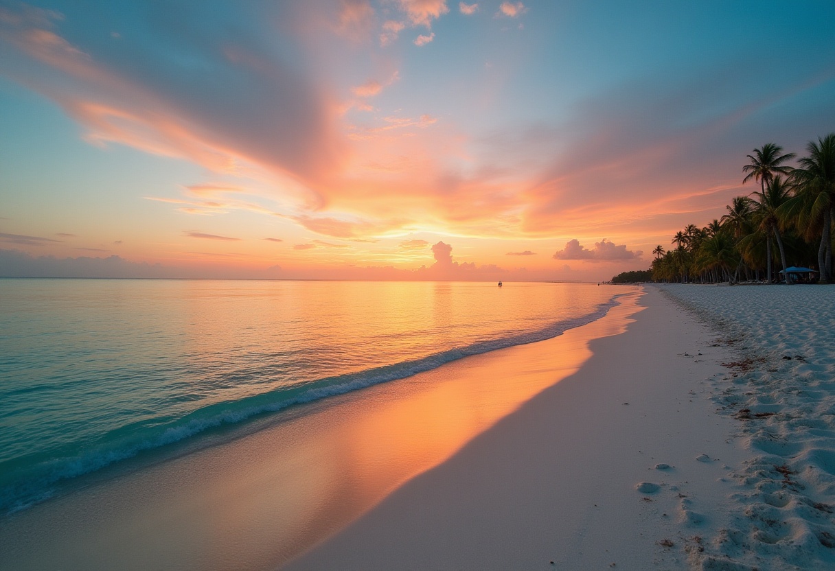 Vibrant sunset colors reflect on tranquil waters while soothing waves meet the soft sandy shore, creating a serene beach atmosphere.
