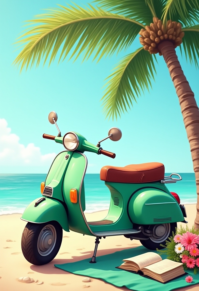 A vintage green scooter is parked on the sandy beach near palm trees. A book and flowers are laid on the beach towel, creating a serene atmosphere.
