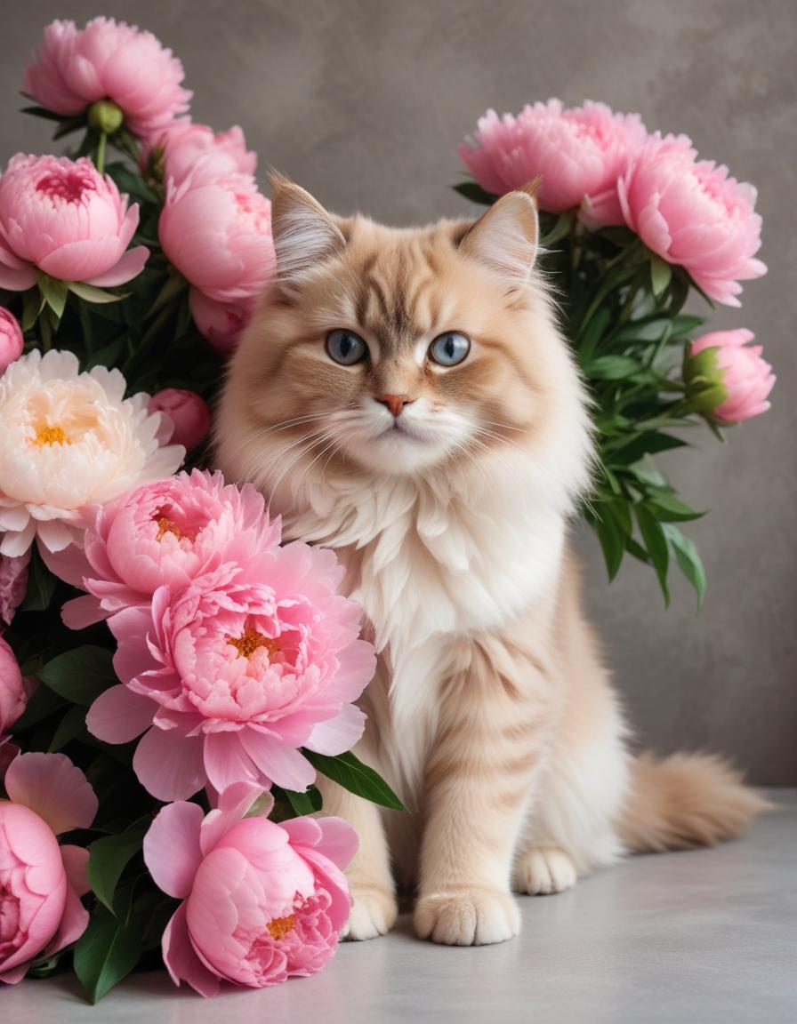 A fluffy cream and orange cat sits gracefully among vibrant pink peonies, capturing the essence of spring with exquisite floral detail.
