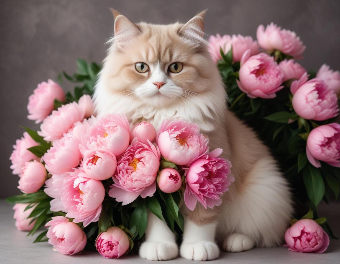 A fluffy cat sits gracefully amidst vibrant pink peonies, creating a charming and serene atmosphere perfect for springtime.