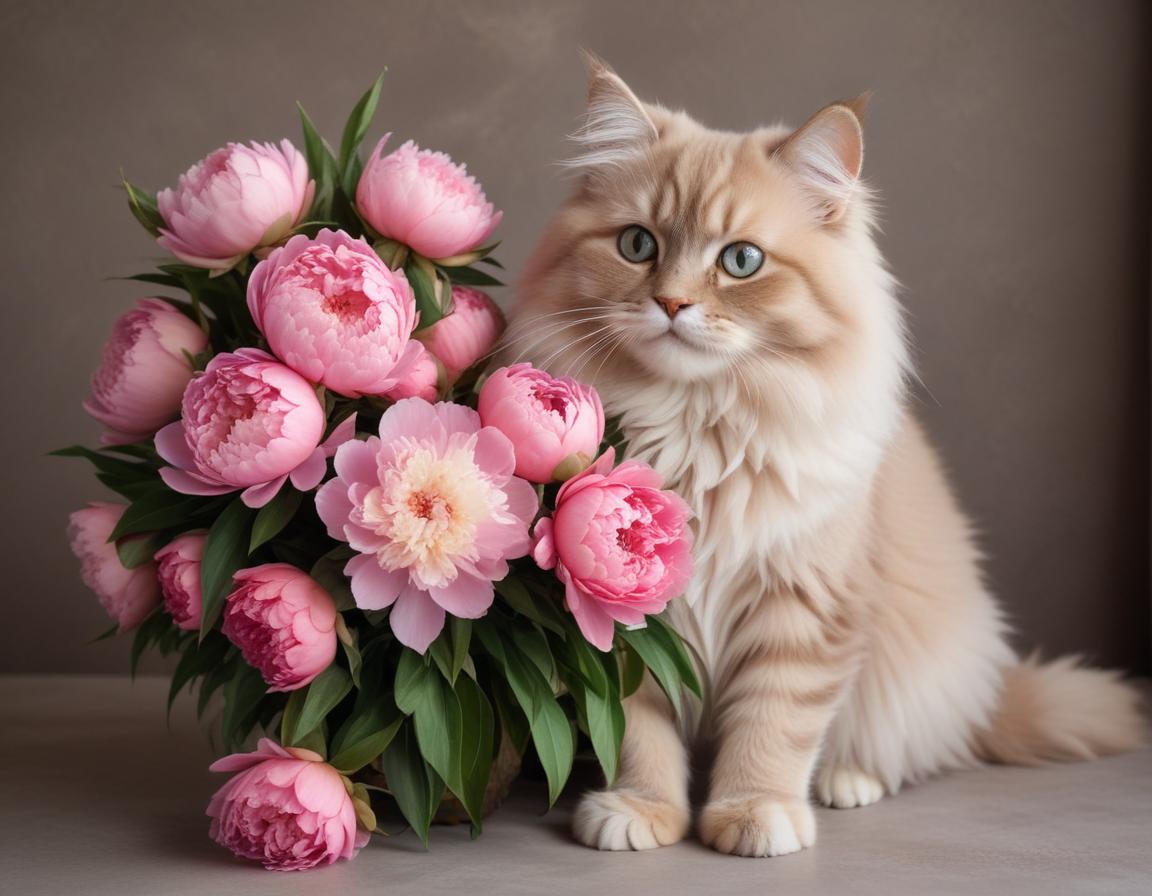Cat beside a bouquet of pink peonies in soft light
