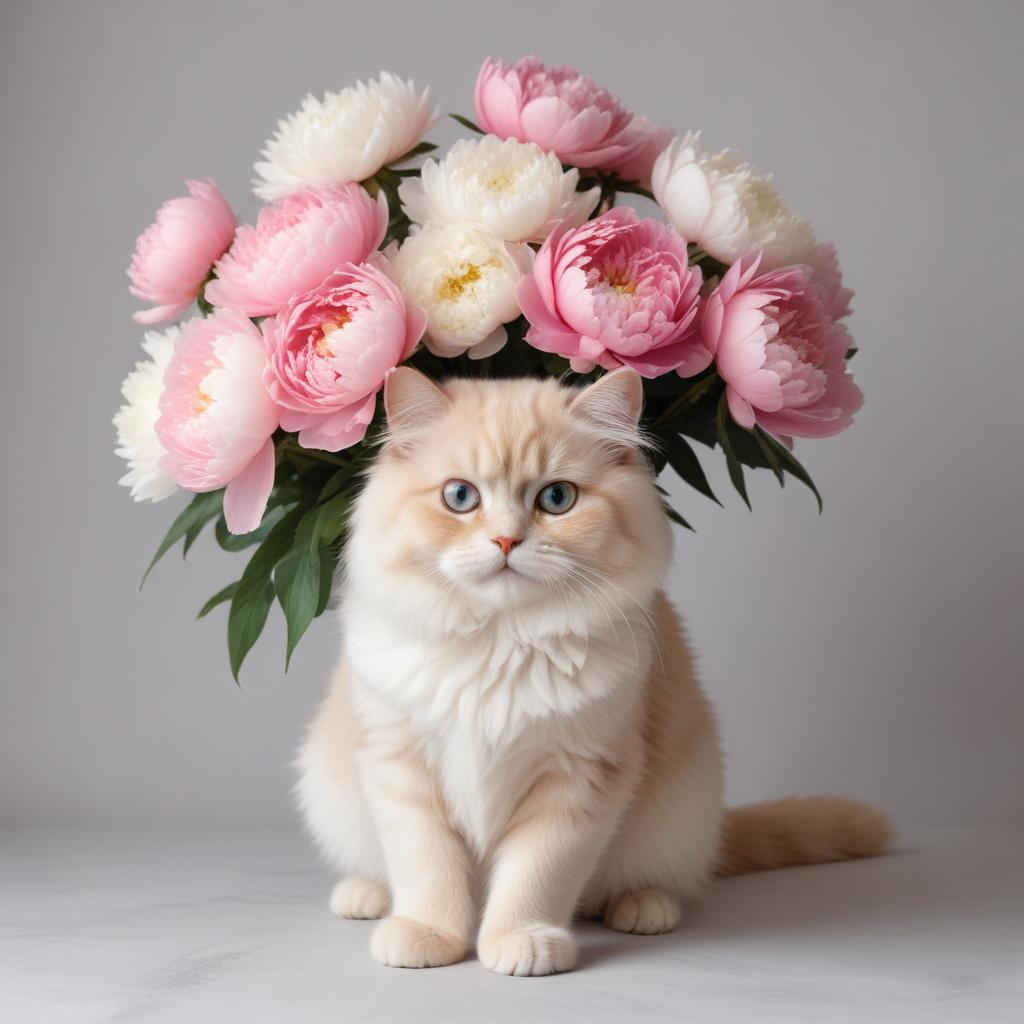 Cat sitting elegantly with a bouquet of peonies on display