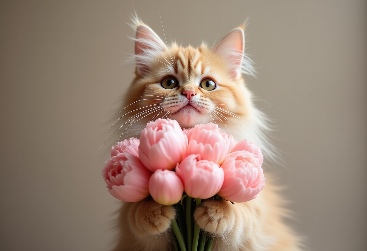 A fluffy cat with orange fur holds a bouquet of pink tulips, showcasing a playful and charming expression in a cozy indoor setting.