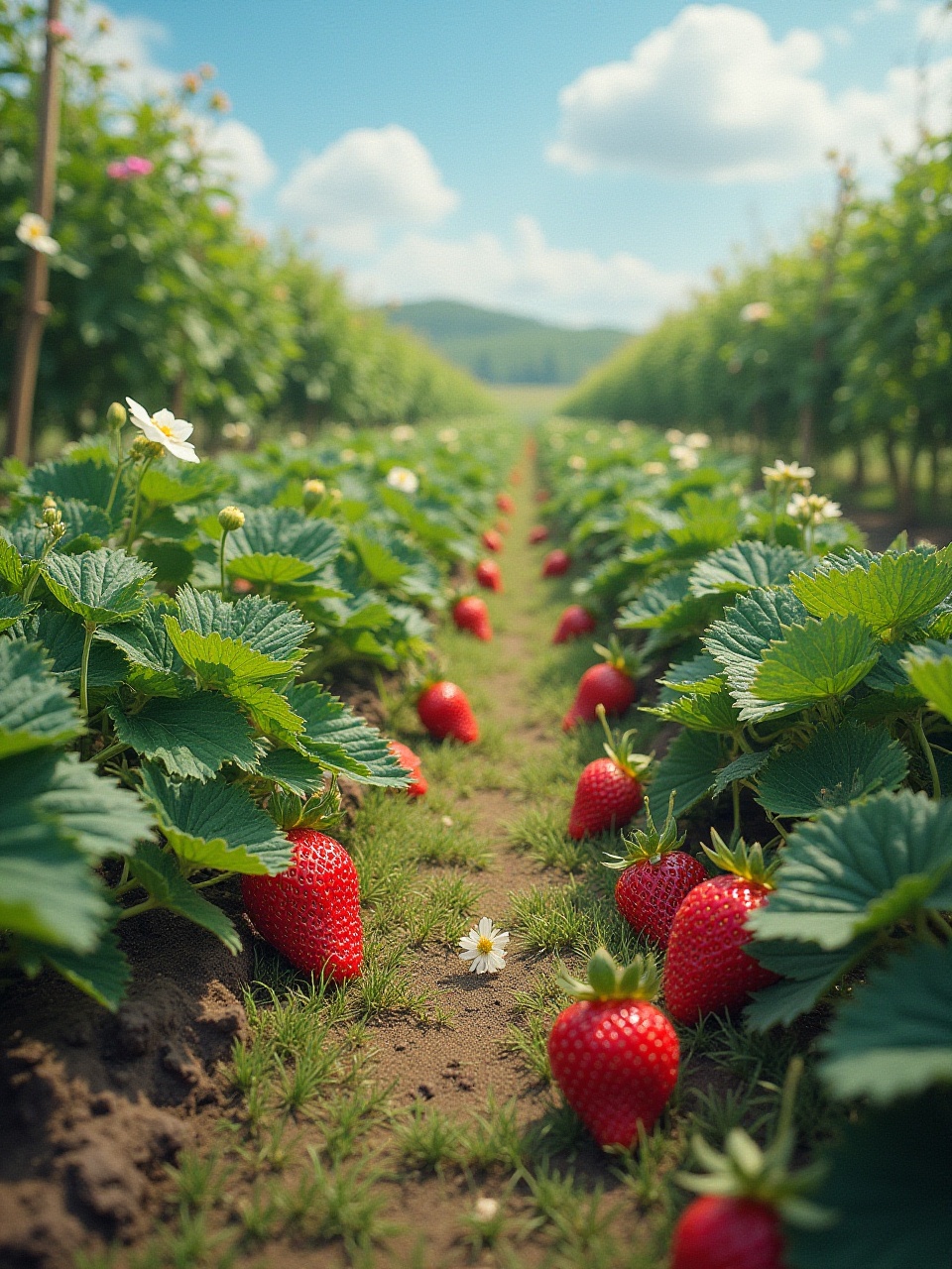 Rows of vibrant strawberry plants show ripe red berries on a sunny day. Lush green leaves frame the fruit against a bright blue sky.