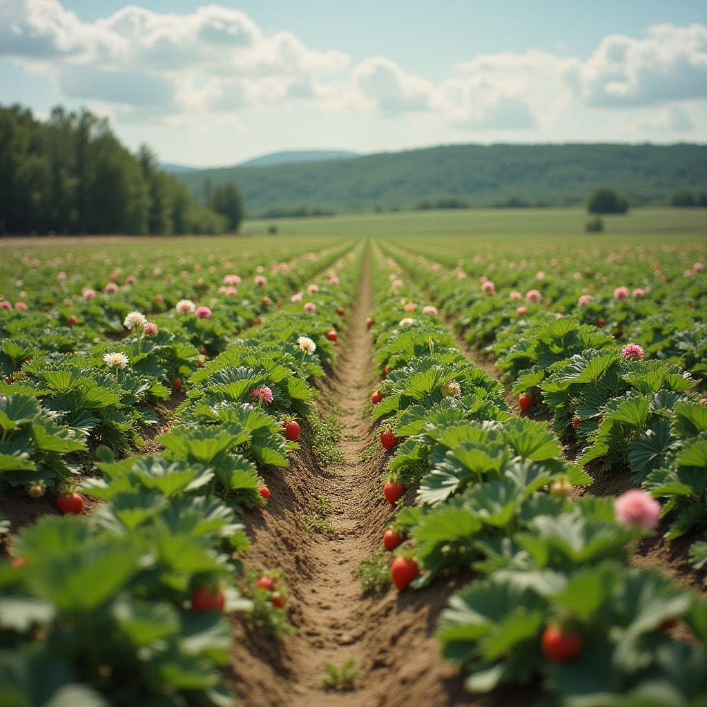 Rows of vibrant green strawberry plants bear ripe fruit under a clear sky. The landscape features rolling hills in the distance.