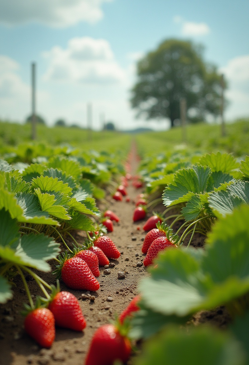 Farmers gather ripe strawberries in a lush green field under a bright blue sky. The harvest creates a vibrant contrast with the soil.