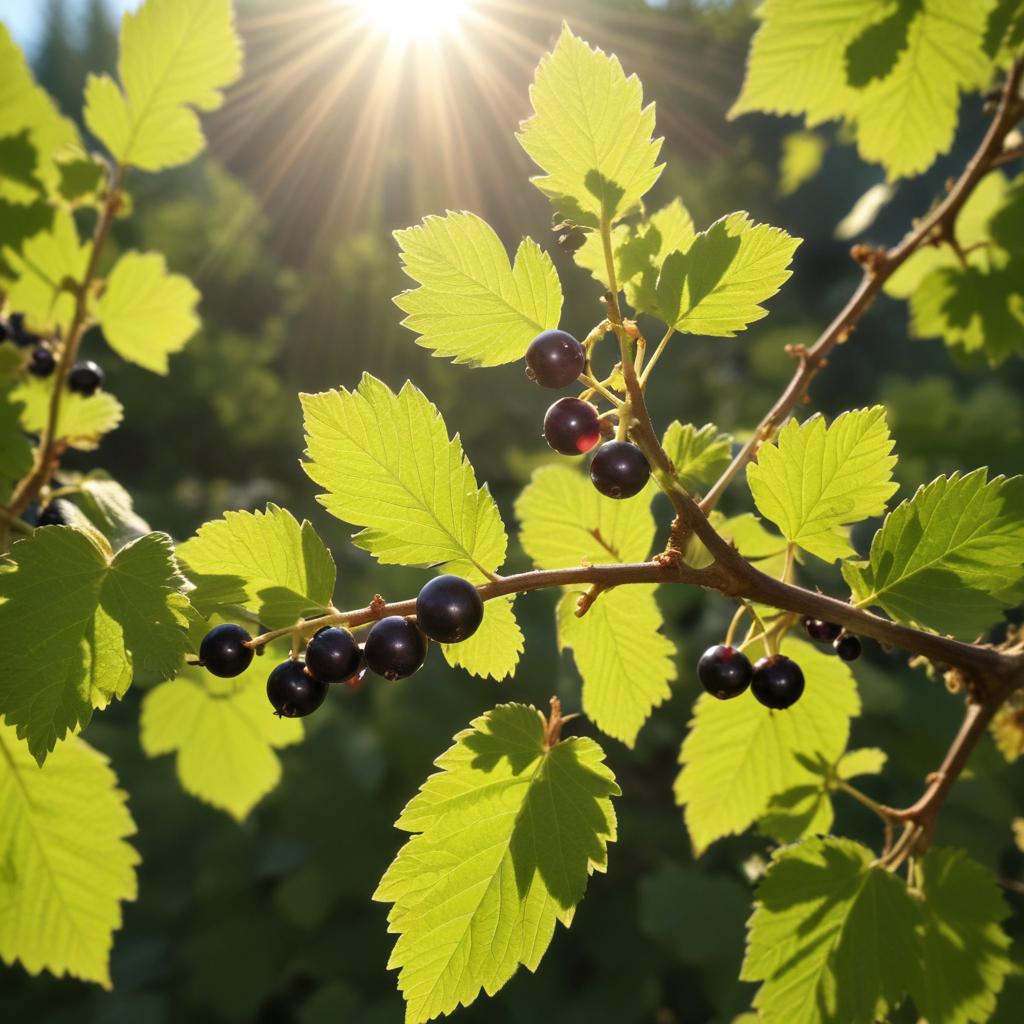 Sunlight shines through vibrant green blackcurrant leaves, highlighting juicy berries in a serene garden setting during early morning.
