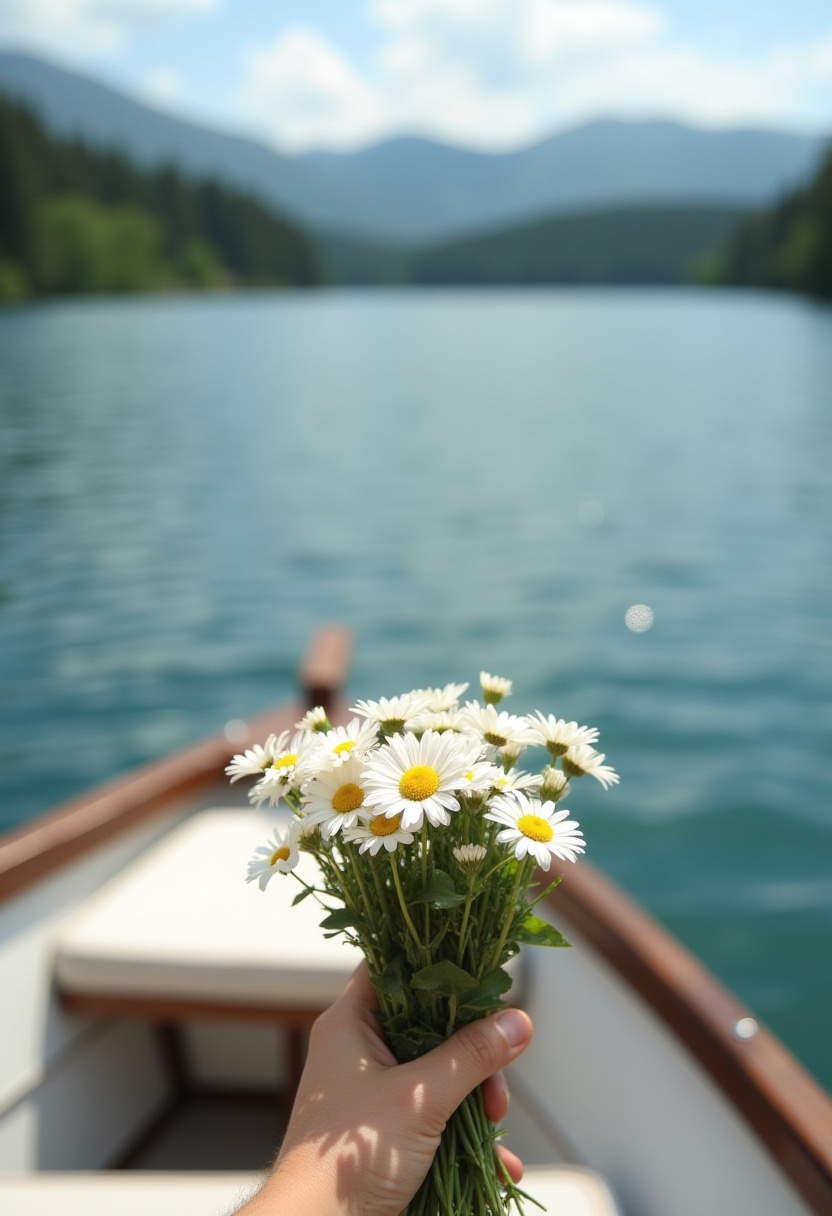 A person enjoys a tranquil boat ride on a serene lake, holding a bouquet of daisies while surrounded by mountains and clear water.
