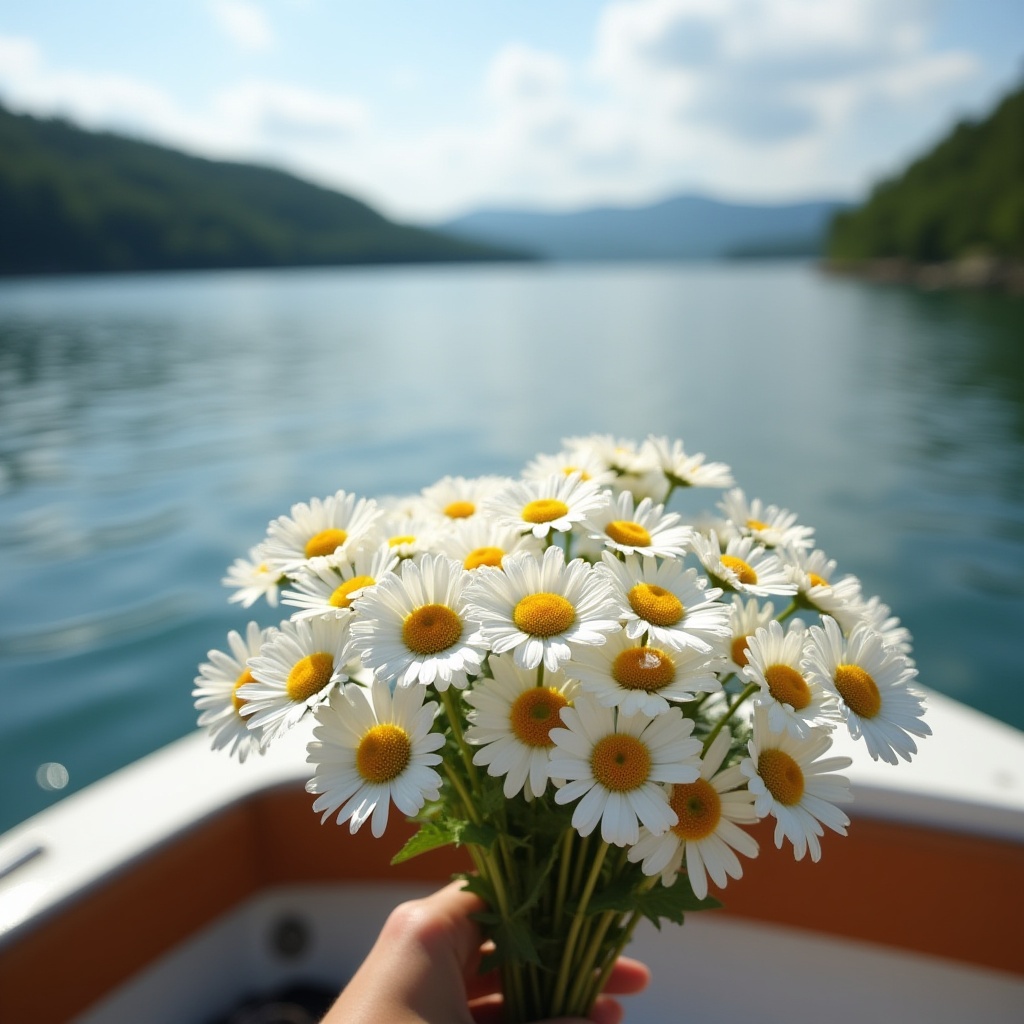 A person holds a bouquet of daisies while standing in a boat on a calm lake, surrounded by lush hills and sunlight.