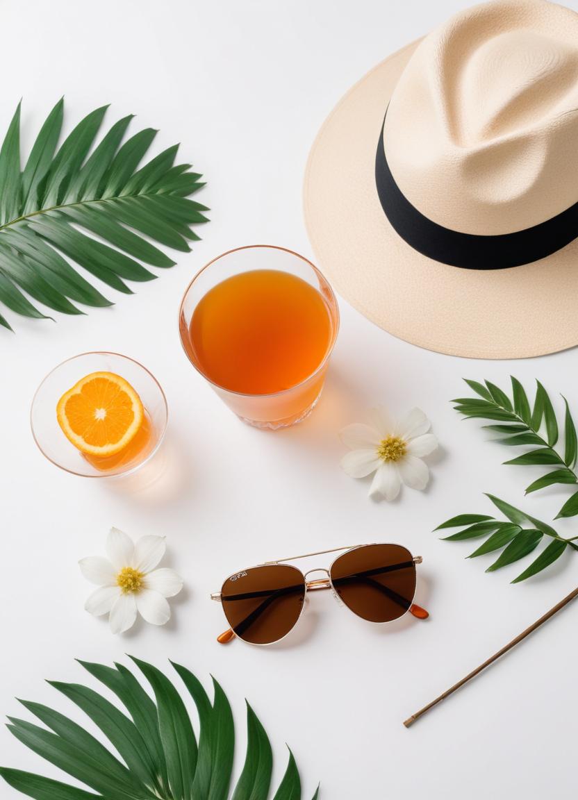bright colors, casual, drinkware, fashion, flowers, greenery, hat, leisure, lifestyle, nature, orange, refreshment, relaxation, stylish, summer, sunglasses, table decor, tropical drinks, vacation, warm weather