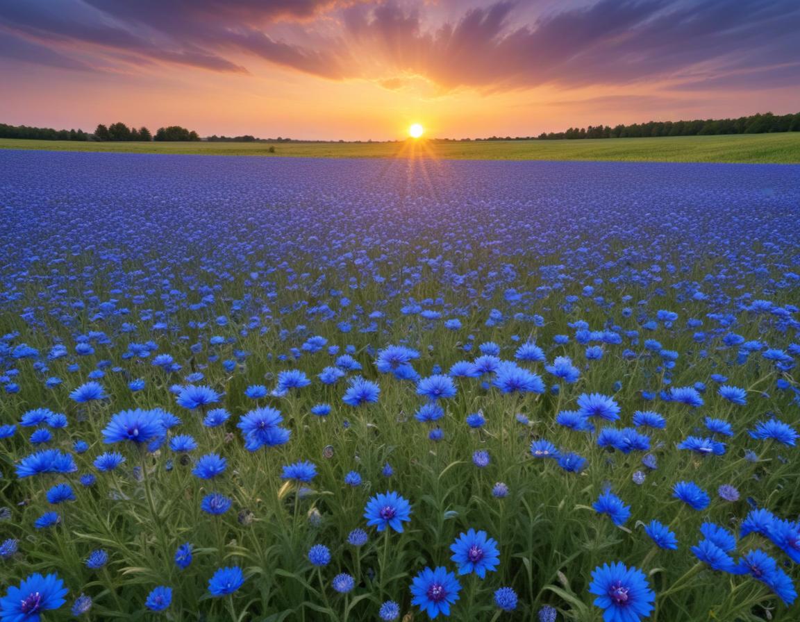 A vibrant field of blue flowers stretches towards the horizon as the sun sets, casting a warm glow over the landscape.