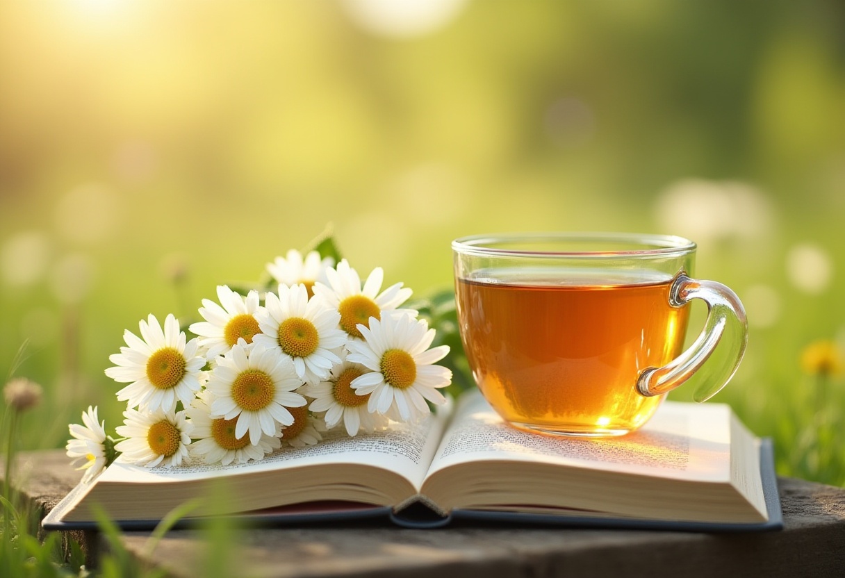 beverage, book, calm, cozy, daisies, flowers, freshness, green field, leisure, nature, organic, peaceful, reading, relaxation, summer, sunlight, sunny afternoon, tea, tranquility, warmth