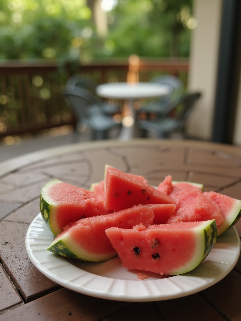 Juicy watermelon slices are arranged on a plate at a cozy outdoor table, surrounded by greenery, inviting a refreshing summer snack.