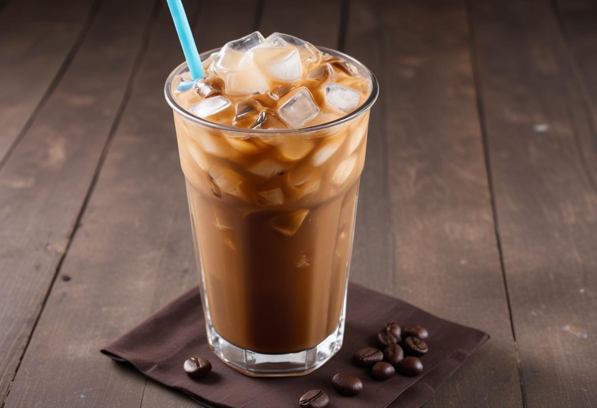Iced coffee served in a tall glass with straw