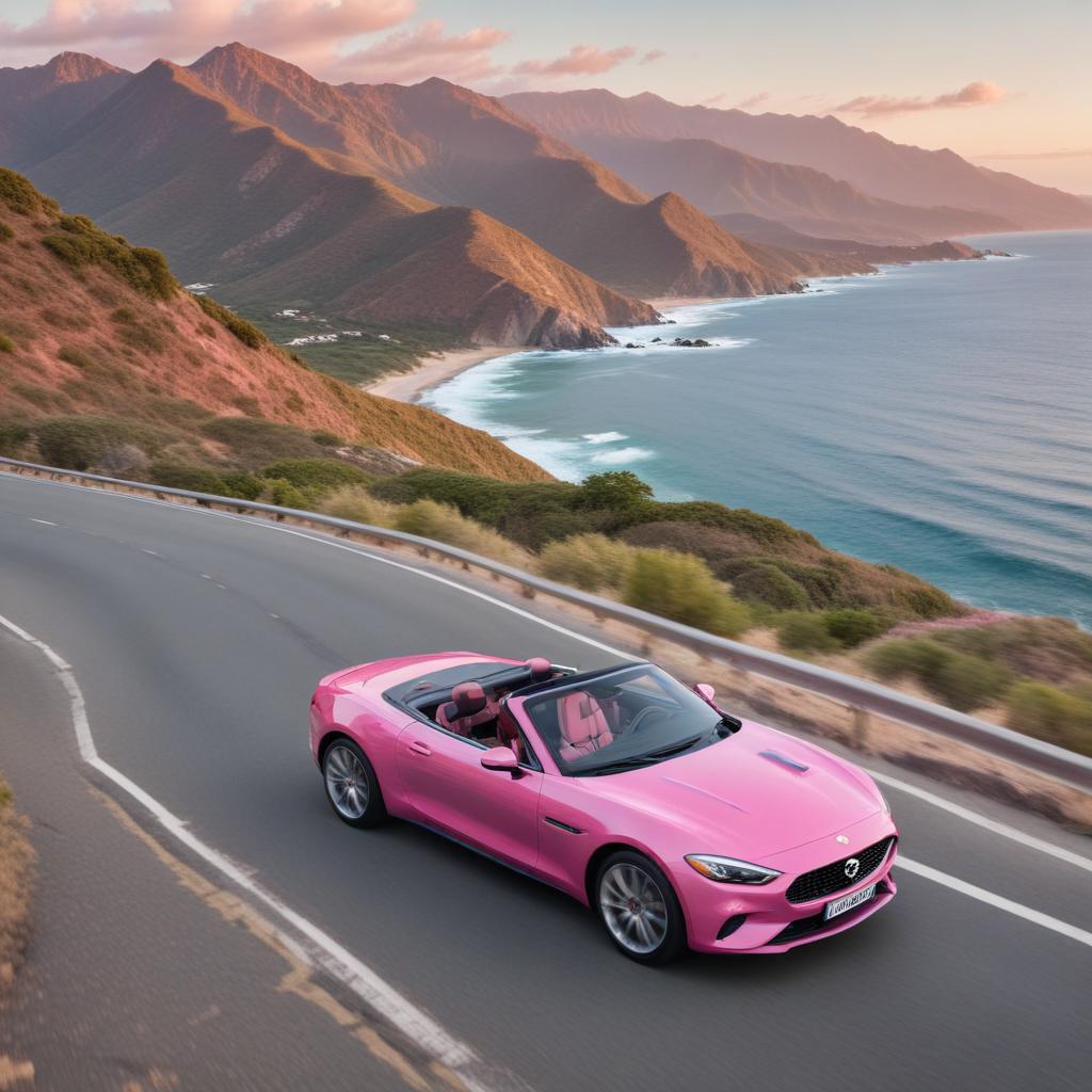 beach views, blue sky, coastal drive, convertible car, enjoyment, leisure activity, luxury car, mountains, nature, ocean waves, outdoor adventure, pink car, pink interior, road trip, scenic route, summer, sunset, thrill, travel, winding road