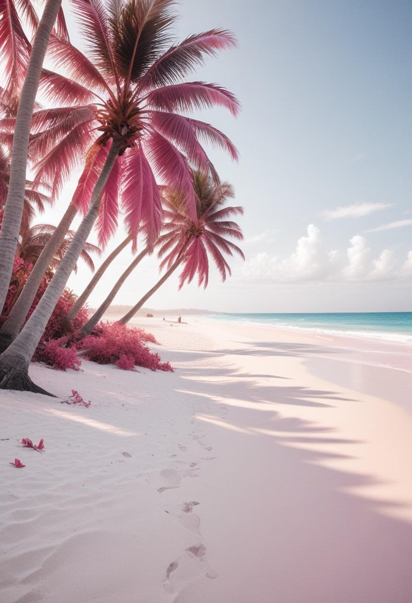A tranquil beach setting features vibrant pink palm trees swaying gently by the sea under a clear blue sky during daylight.