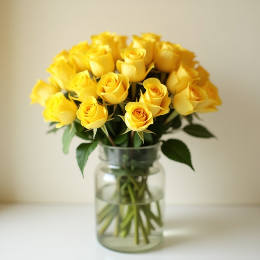 A vibrant arrangement of yellow roses is displayed in a clear glass vase on a simple surface, adding brightness to the decor.