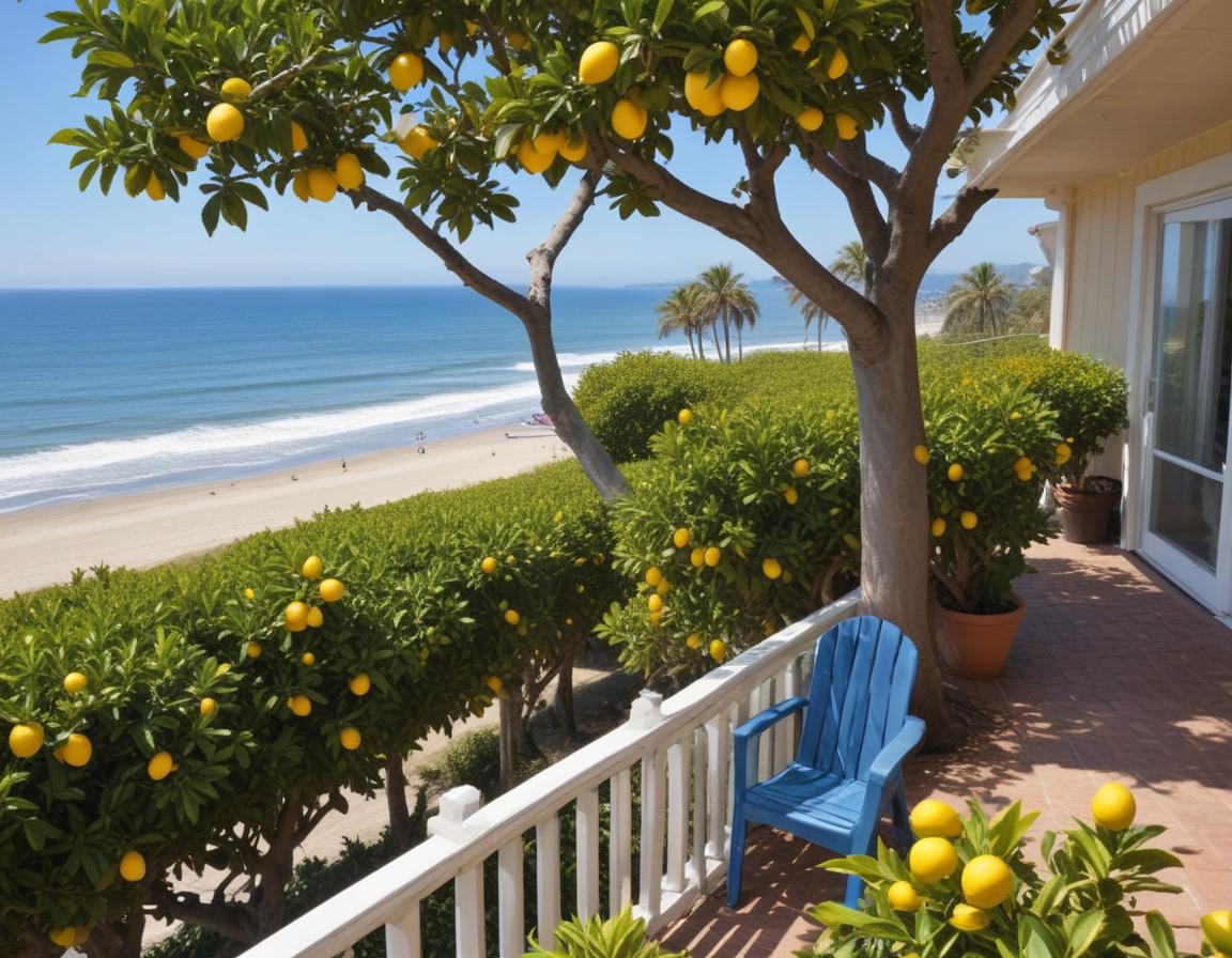 balcony, beach, blue sky, coastal view, fruit trees, garden, landscape, leisure, lemon trees, nature, ocean, outdoor living, palm trees, relaxation, sand, seaside, summer, sunny day, tranquility, vacation