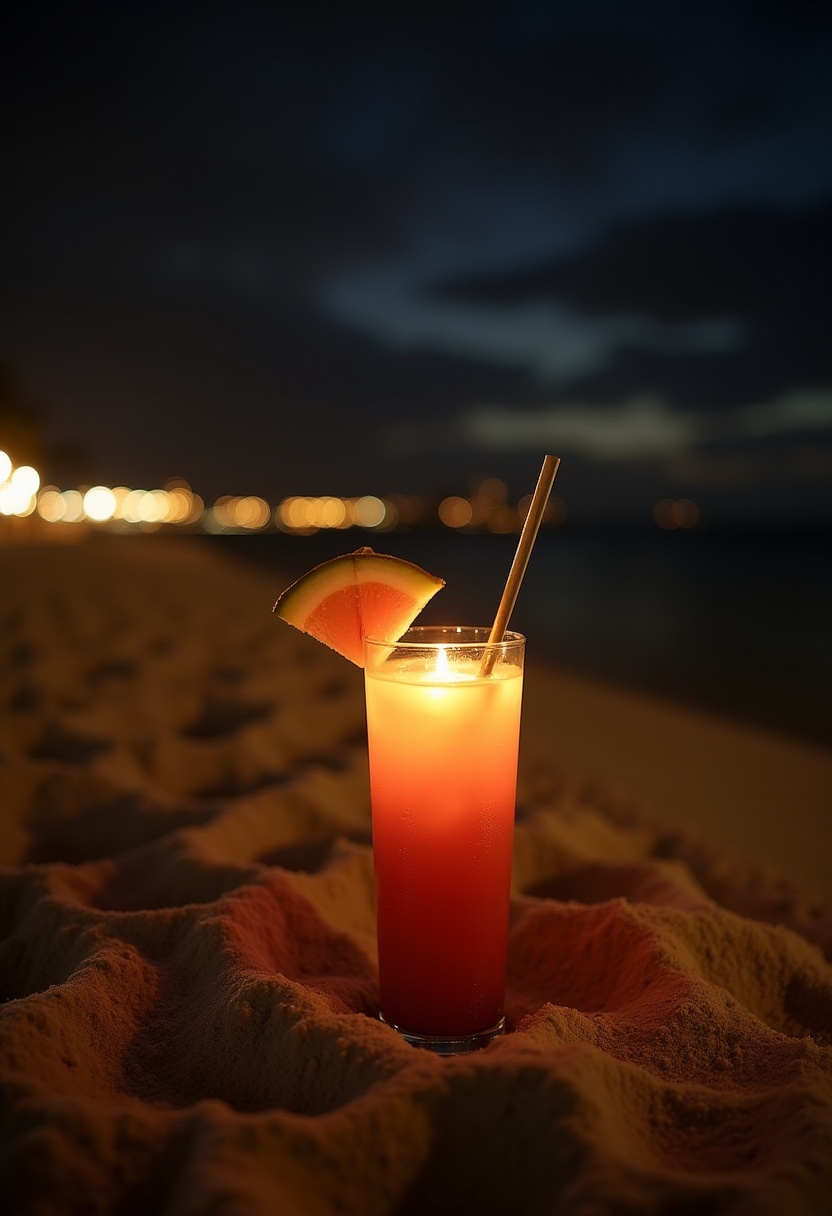 A colorful cocktail sits on the sand at dusk, illuminated by a soft glow. The beach is calm, with distant lights adding a magical touch.