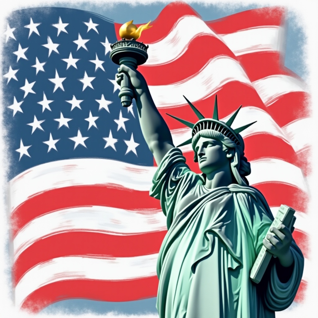 Statue of liberty stands proudly with american flag backdrop