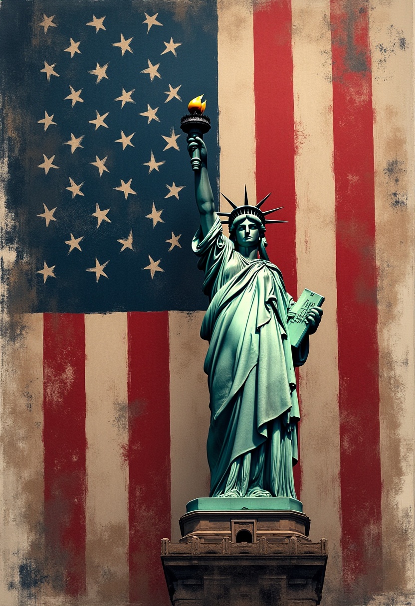 The Statue of Liberty is prominently displayed against a faded American flag background, symbolizing freedom and hope in a vibrant city.