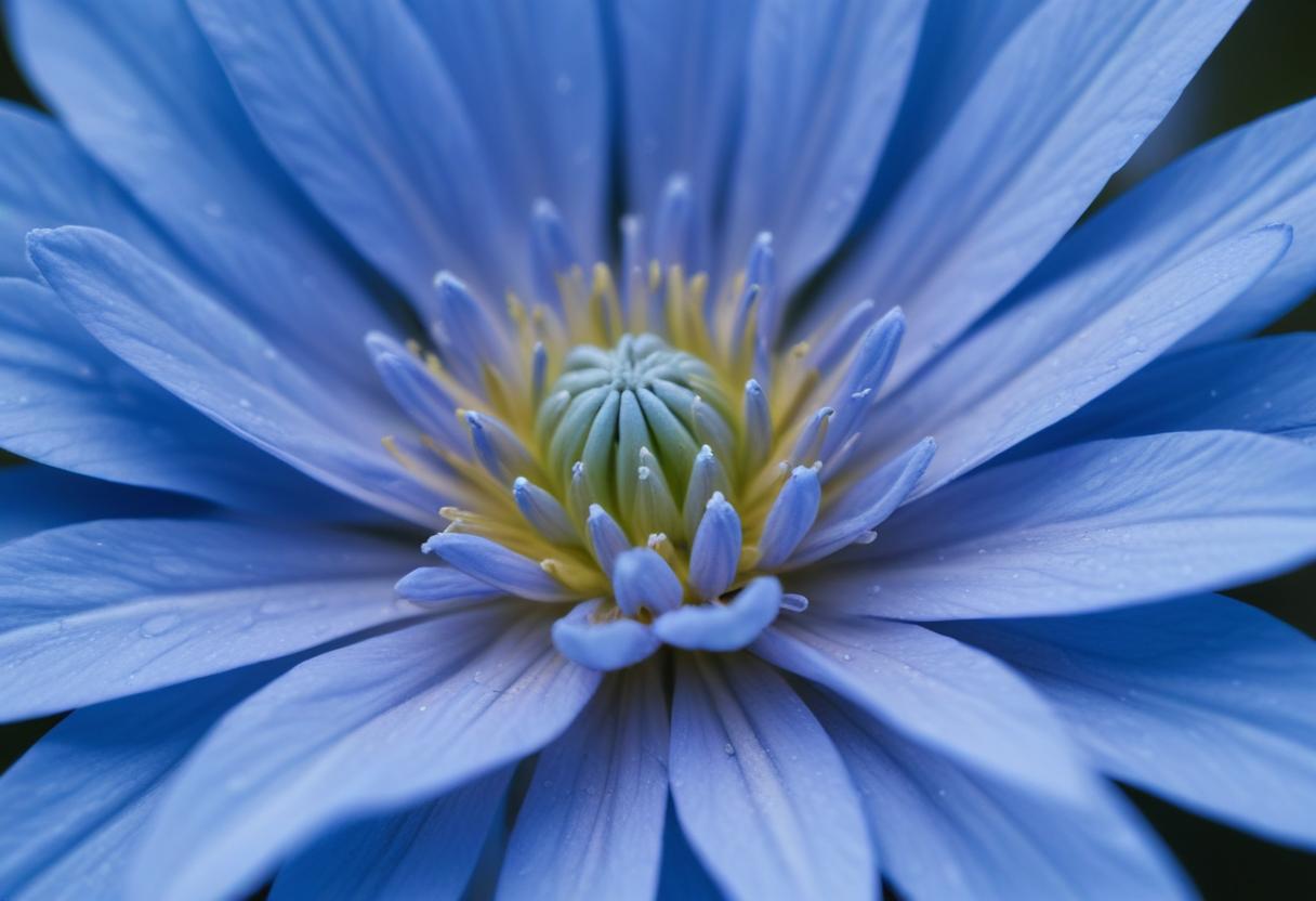 A vibrant blue water lily is fully open, showcasing delicate petals and a serene atmosphere. The flower is surrounded by soft green elements.