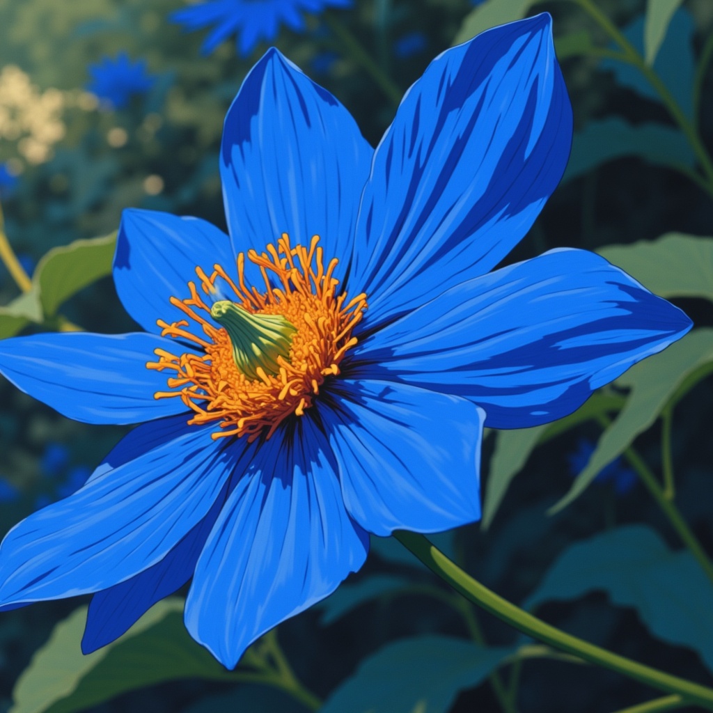 A stunning blue flower with orange stamen stands out in a lush garden filled with green foliage and vibrant colors during daylight.